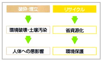 しかし、環境破壊や人体への影響を放置できなくなっており、多くの自治体がリサイクルの処理の推進を行っております。